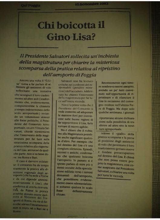 Renato Imbriani mi sorprende, “taggandomi” in una foto con la quale pubblica un mio vecchio articolo, che uscì sul quotidiano “Qui Foggia” il 15 settembre 1983, significativamente intitolato “Chi boicotta il Gino Lisa?”