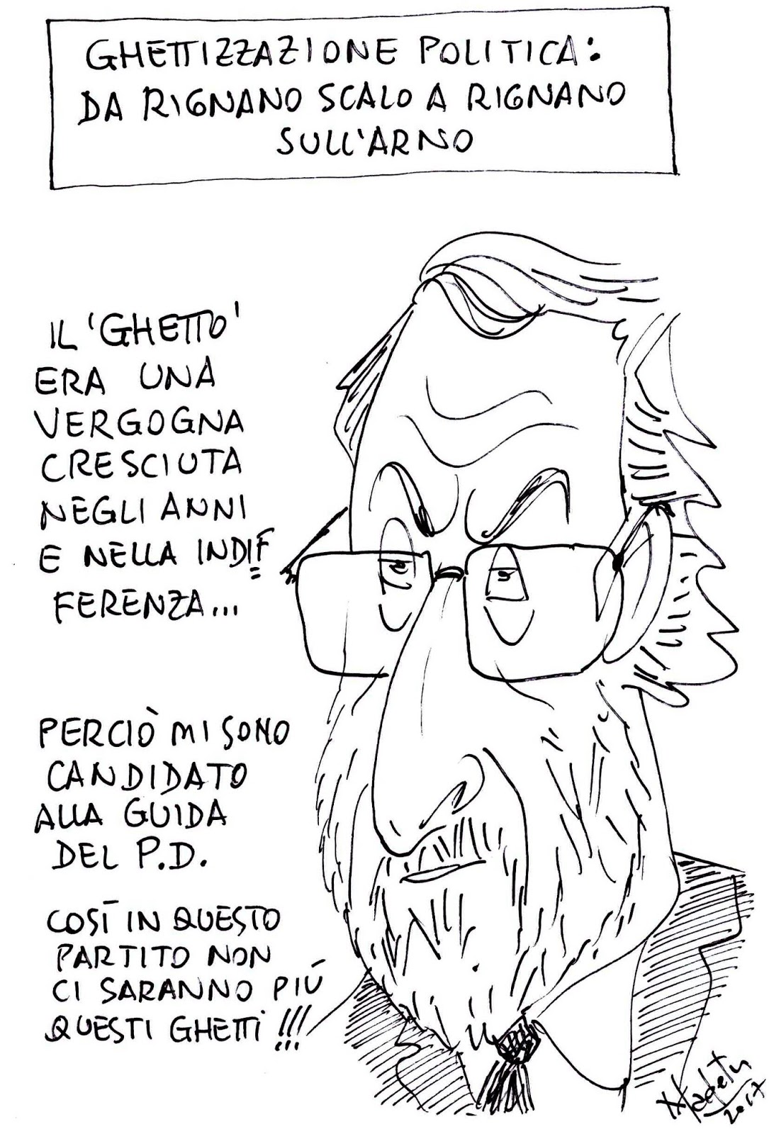 Le due Rignano accomunano, in un certo senso, i due sfidanti alla poltrona di segretario del Pd: la Rignano Garganica di Puglia con Michele Emiliano, che ha smantellato con successo il Ghetto, la Rignano toscana sull’Arno con Matteo Renzi. Leggete le intenzioni che il nostro disegnatore satirico attribuisce al governatore regionale pugliese.