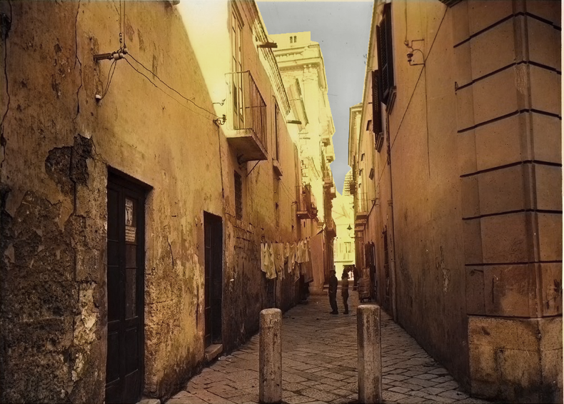 La foto colorizzata che Lettere Meridiane regala oggi ad amici e lettori riguarda un pezzo di Foggia che non esiste più: Borgo Scopari, il rione che sorgeva negli anni Trenta nel cuore della città, dove si trova oggi via Dante.