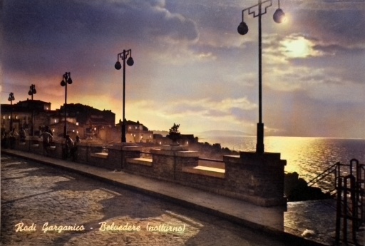 Guardate che spettacolo, quest’antica cartolina del belvedere di Rodi: un tramonto catturato dall’ignoto autore della fotografia nel momento migliore, quando il sole offre ancora quel tanto di luce sufficiente a disegnare un paesaggio d’incanto, con le ombre che fanno presagire una notte serena e magica.