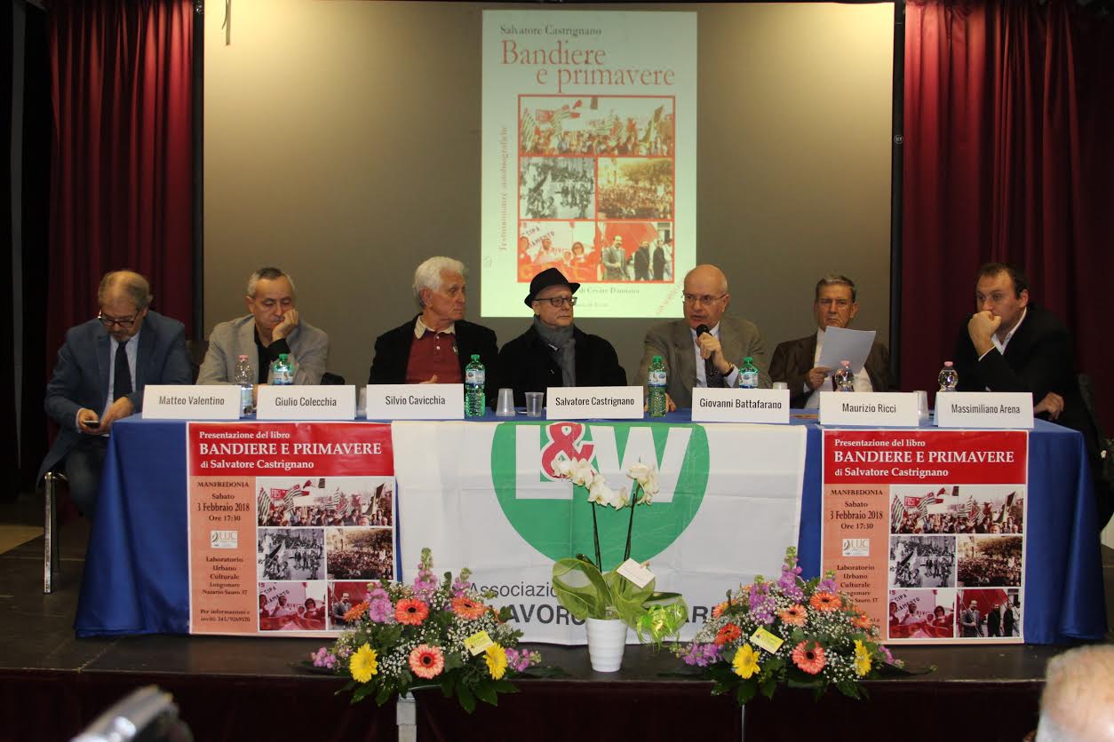 Non succede spesso che alla presentazione di un libro che racconta episodi pure importanti di storia del territorio assistano più di centocinquanta persone, e che il libro si venda al banchetto a ciò preposto, come se si trattasse del romanzo in cima alle classifiche. È successo sabato scorso, al Laboratorio Urbano Culturale di Manfredonia, e in fondo non c’è poi da meravigliarsi più di tanto. Perché si trattava della presentazione di “Bandiere e Primavere”, scritto (per i tipi di Edizioni del Rosone) da Salvatore Castrignano: uno che gli eventi narrati li ha vissuti in prima persona, ed è tra ultimi grandi protagonisti di quella Capitanata che sognava, lottava, programmava, e caparbiamente cercava di costruire il suo futuro.